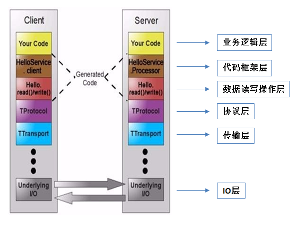 对于复杂的服务间调用,我们抽象出五元组的概念:(From, FromCluster, To, ToCluster, Method)。每一个五元组唯一定义了一类的RPC调用。以五元组为单元,我们构建了一整套微服务架构。 我们使用 Go 语言研发了内部的微服务框架 kite,协议上完全兼容 Thrift。以五元组为基础单元,我们在 kite 框架上集成了服务注册和发现,分布式负载均衡,超时和熔断管理,服务降级,Method 级别的指标监控,分布式调用链追踪等功能。目前统一使用 kite 框架开发内部 Go 语言的服务,整体架构支持无限制水平扩展。 Go 的并发属于 CSP 并发模型的一种实现,CSP 并发模型的核心概念是:“不要通过共享内存来通信,而应该通过通信来共享内存”。这在 Go 语言中的实现就是 Goroutine 和 Channel。 thrift包含的三个组件 protocol:协议层,定义序列化 transport:客户端和服务端的通信 server:从transport接收消息,并写回